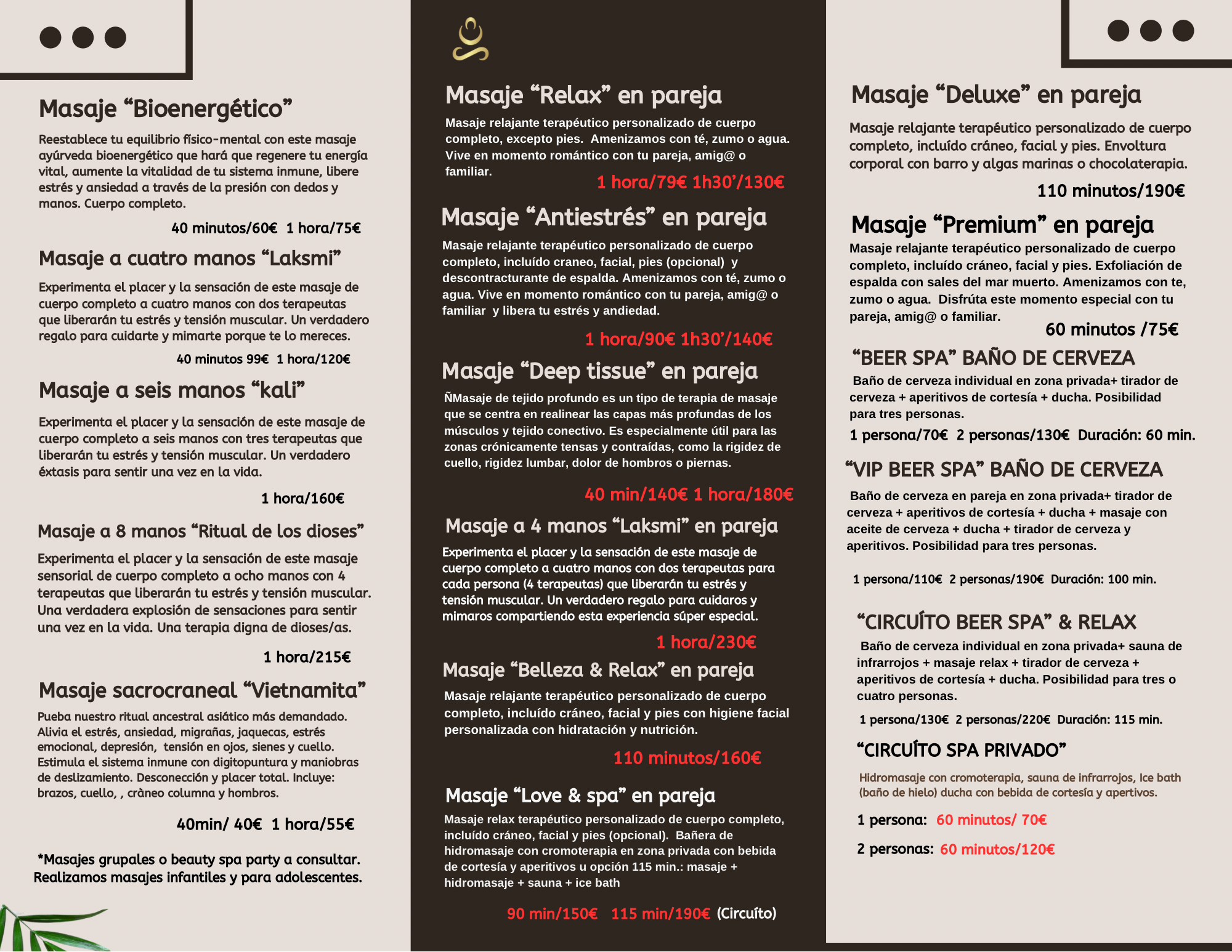 Con nuestra variedad de servicios podrás: desconectar por un momento del trabajo, los hijos, calmar tu estrés, canalizar tu energía y negatividad, así rebajar tensiones posturales y musculares, etc. Pregúntanos sin compromiso y te asesoraremos.