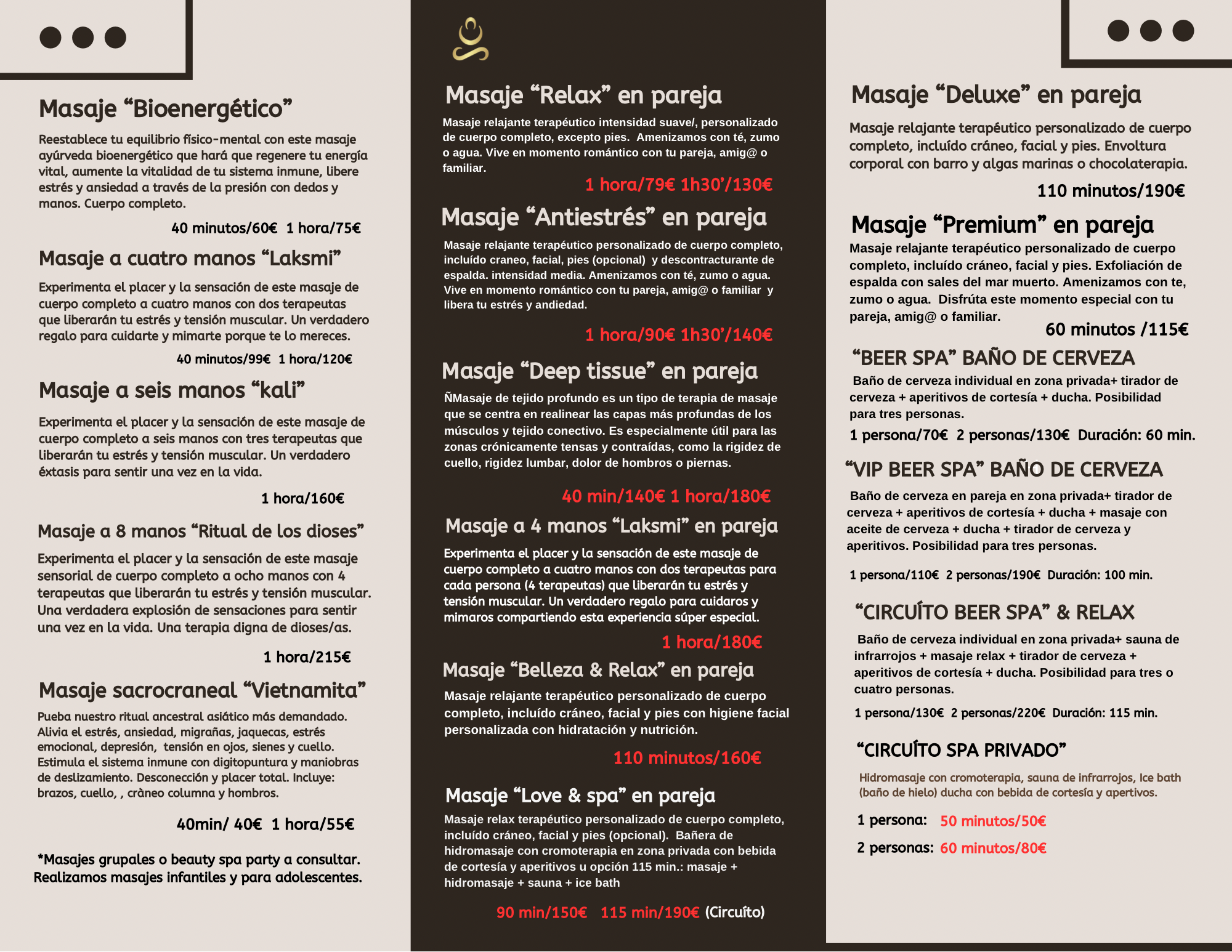 Con nuestra variedad de servicios podrás: desconectar por un momento del trabajo, los hijos, calmar tu estrés, canalizar tu energía y negatividad, así rebajar tensiones posturales y musculares, etc. Pregúntanos sin compromiso y te asesoraremos.